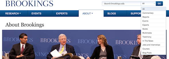Brookings、edu:打開(kāi)菜單選項下拉搜索框供用戶(hù)選擇搜索范圍。