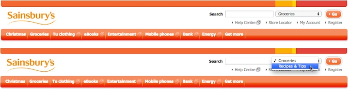 Sainsburys、co、uk(英國最大的超市之一)由于搜索框的設置,對于貨物的搜索可能不會(huì )引起消費者的注意。更糟糕的是下拉選擇范圍只有兩類(lèi),這并不代表本公司銷(xiāo)售全系列的產(chǎn)品,消費者若想查找到諸如營(yíng)業(yè)時(shí)間等信息時(shí)也只能聽(tīng)天由命、