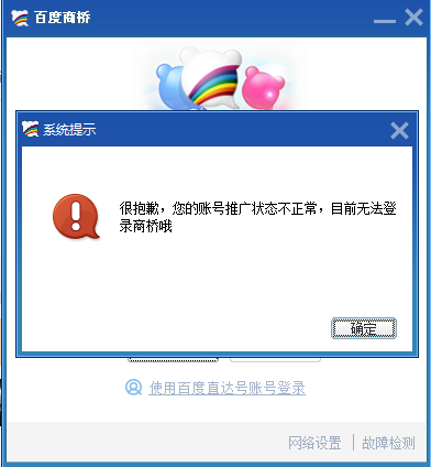很抱歉,您的帳號推廣狀態(tài)不正常,目前無(wú)法登錄商橋哦...